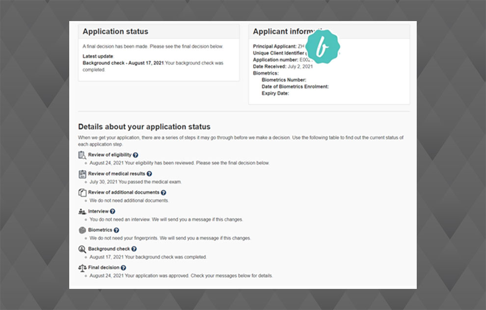 客户委托我们申请的是联邦快速通道EE类别,在2021年 6月6日工作满一年的当天入池,6月10号被系统抽中,7月2日准备完所有材料递交。随后,在7月30日,移民局确认体检合格,并同时录完指纹信,8月19日收到确认邮件。8月23日收到要求上传照片和确认地址,最后于8月24日的Final decision收到ecopr通过永居(PR)申请。